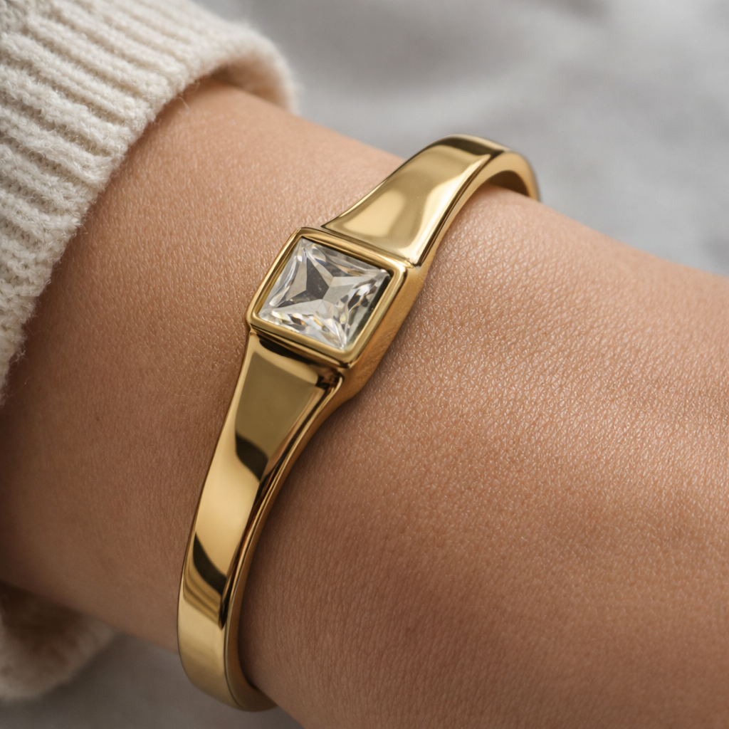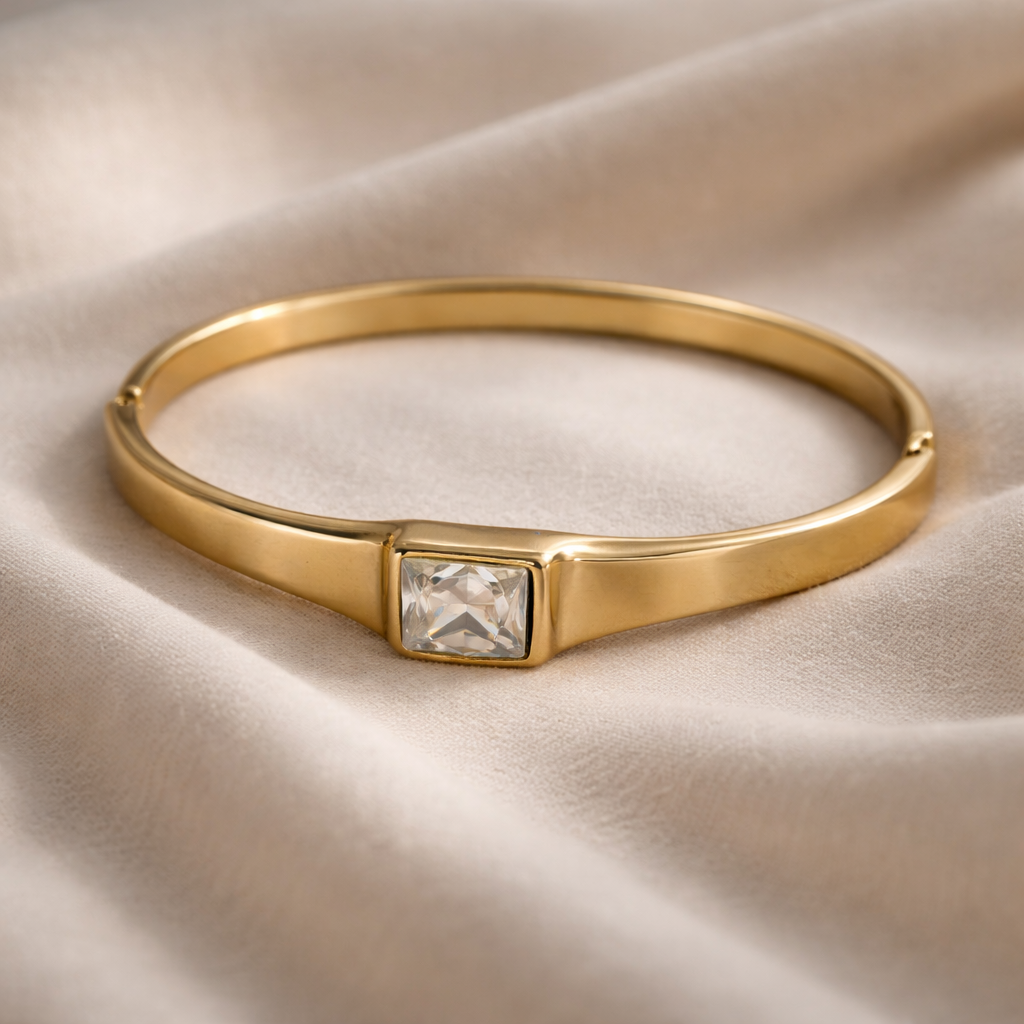 The Aurelia Prism Bangle is a refined statement of modern elegance. Designed with a sleek, structured gold-tone bangle silhouette, this piece is accented by a striking square-cut crystal centerpiece that catches the light with every movement. Clean lines and a smooth polished finish give it a contemporary, architectural feel perfect for lovers of understated luxury.