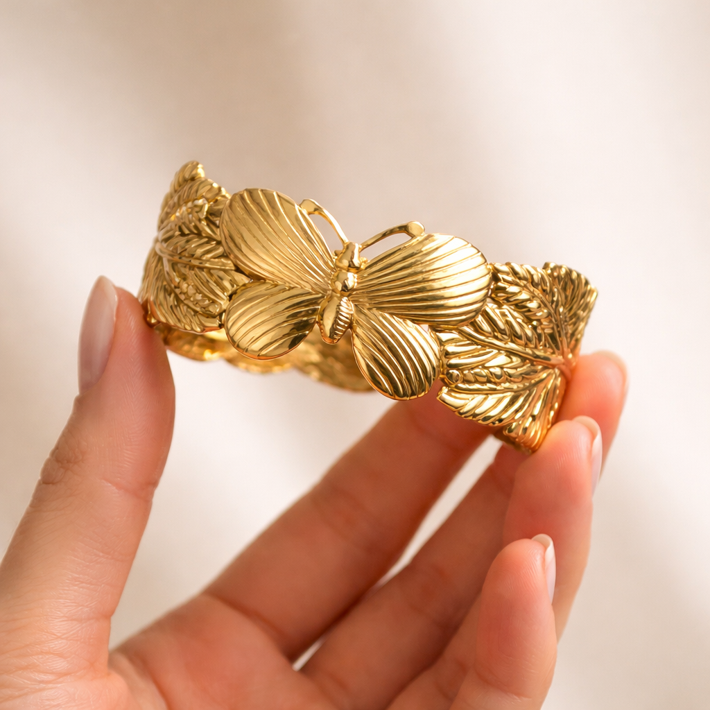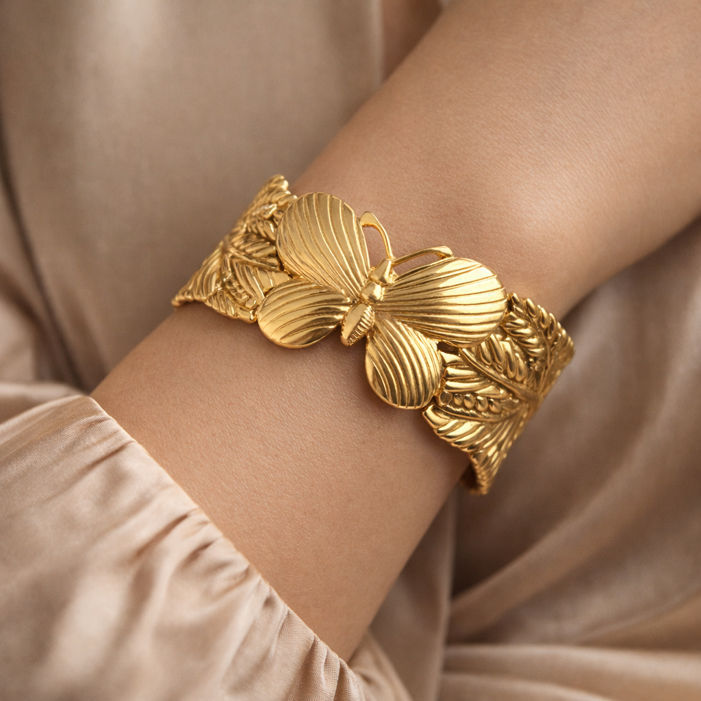 The Papillia Bloom Cuff Bracelet is a statement piece inspired by delicate petals and graceful wings in full bloom. Featuring a sculpted floral centerpiece with flowing leaf textures, this cuff embodies elegance, femininity, and timeless charm. Its detailed design reflects light beautifully, creating a refined yet bold look on the wrist.