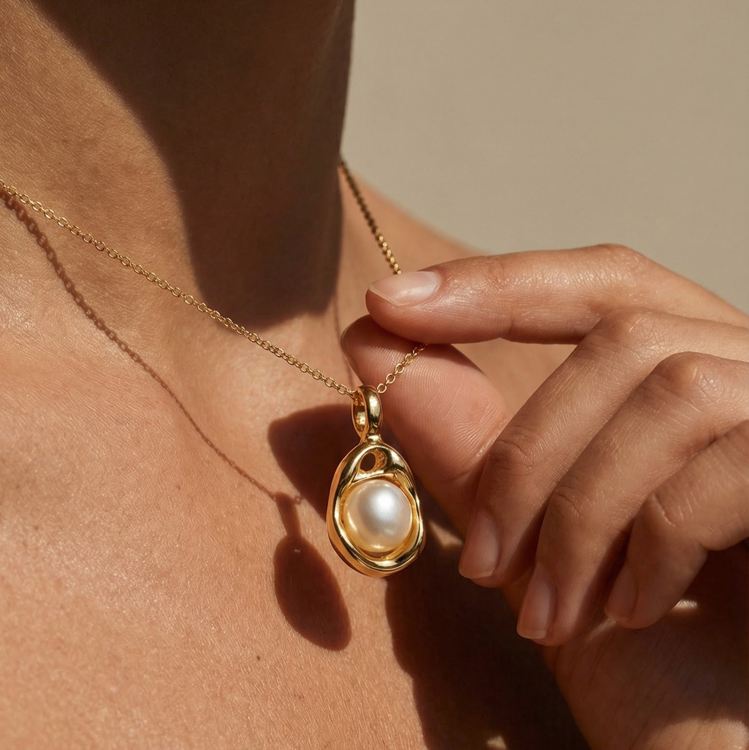 The Pearly Glow Anti-Tarnish Pendant Necklace embodies timeless elegance with a modern minimalist touch. Crafted from premium 316L stainless steel, this necklace features a smooth gold-tone organic pendant design, delicately framing a luminous pearl centre for a refined, understated statement.