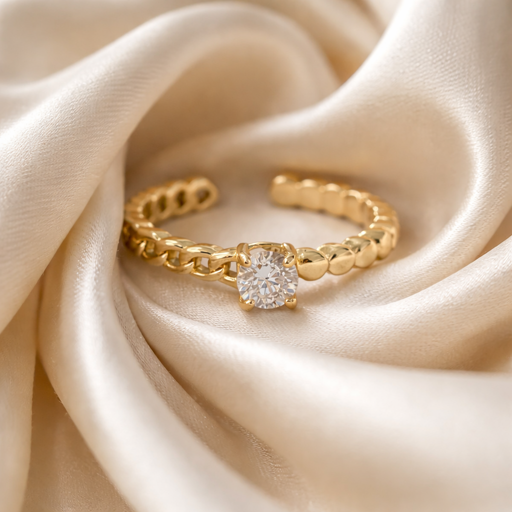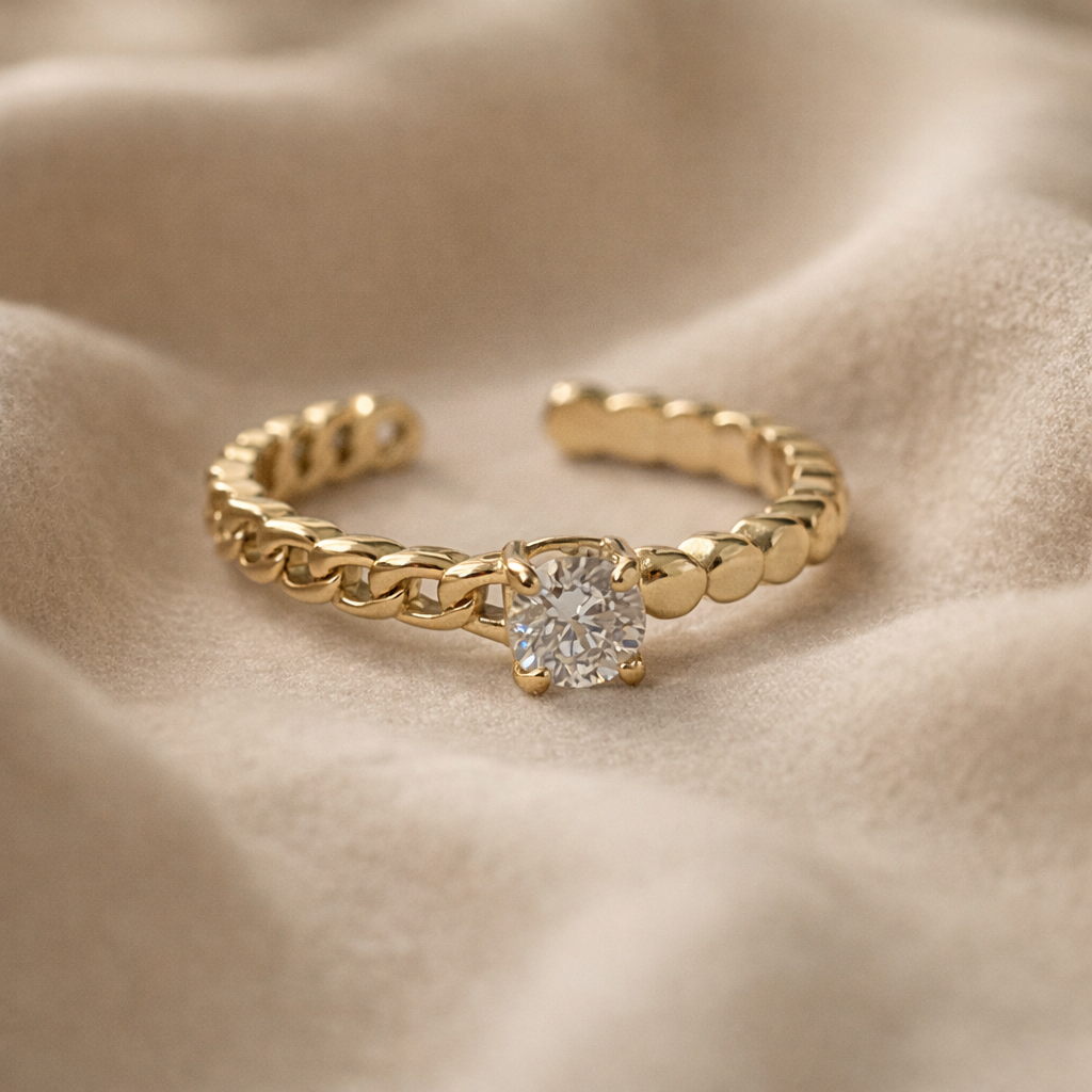 The Aurelia Chain Solitaire Ring blends bold texture with refined elegance. Designed with a delicate chain-link band and finished with a brilliant solitaire centerpiece, this ring strikes the perfect balance between modern edge and timeless beauty. The open-ended silhouette adds a contemporary feel while ensuring a comfortable, adjustable fit.