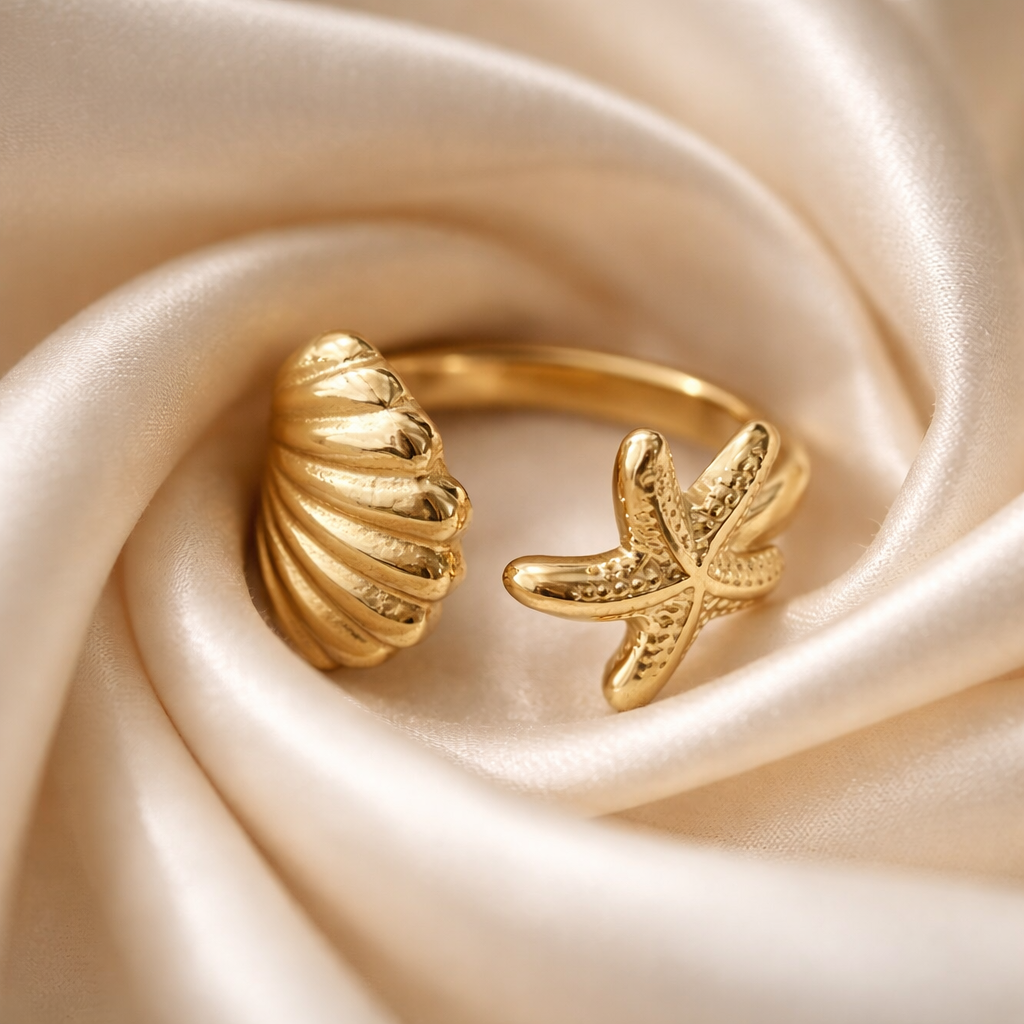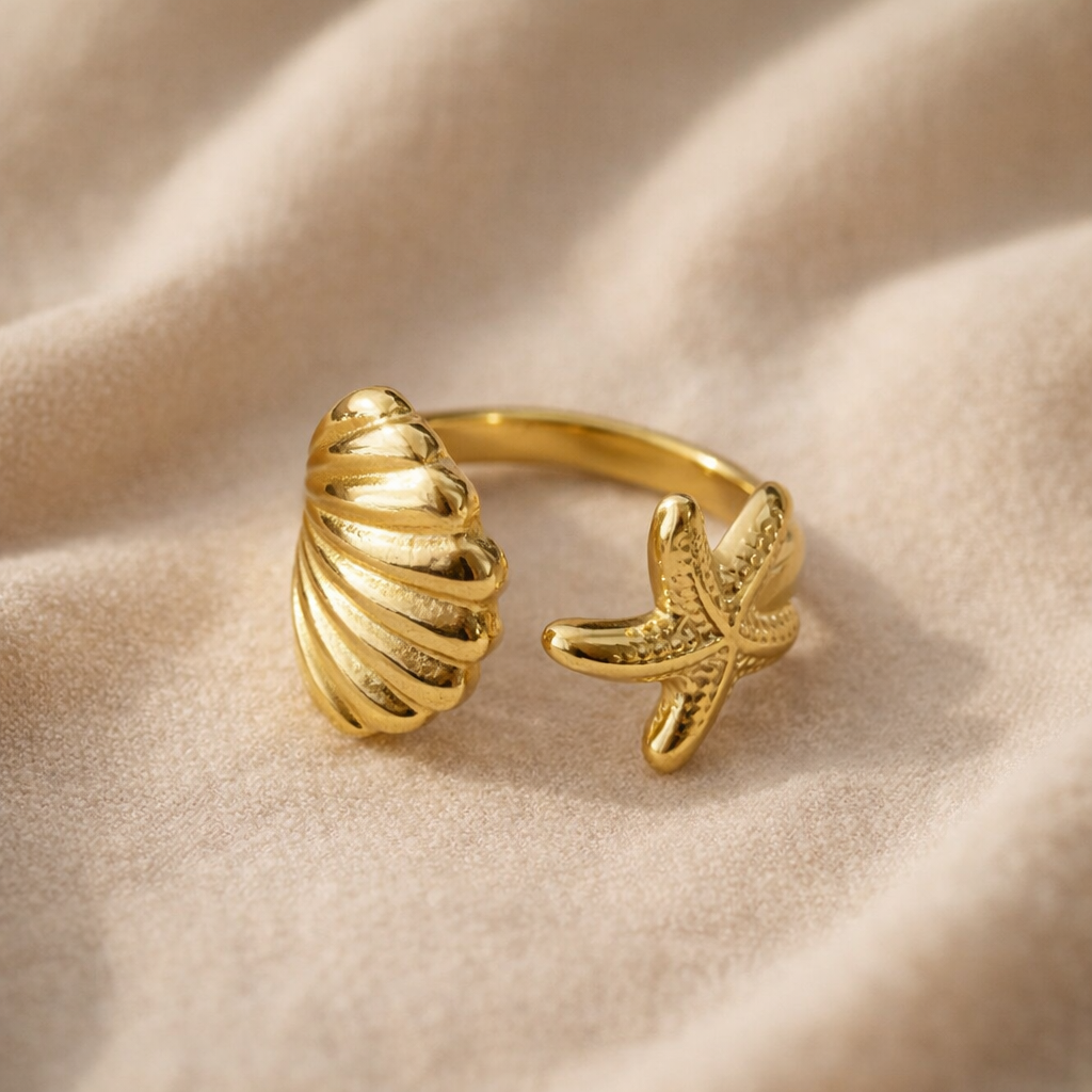 Inspired by the effortless beauty of the ocean, the Marina Shell & Star Open Ring brings coastal elegance into a modern statement design. Featuring a sculpted seashell on one end and a delicately detailed starfish on the other, this open ring captures the harmony of sea and shore in radiant gold.