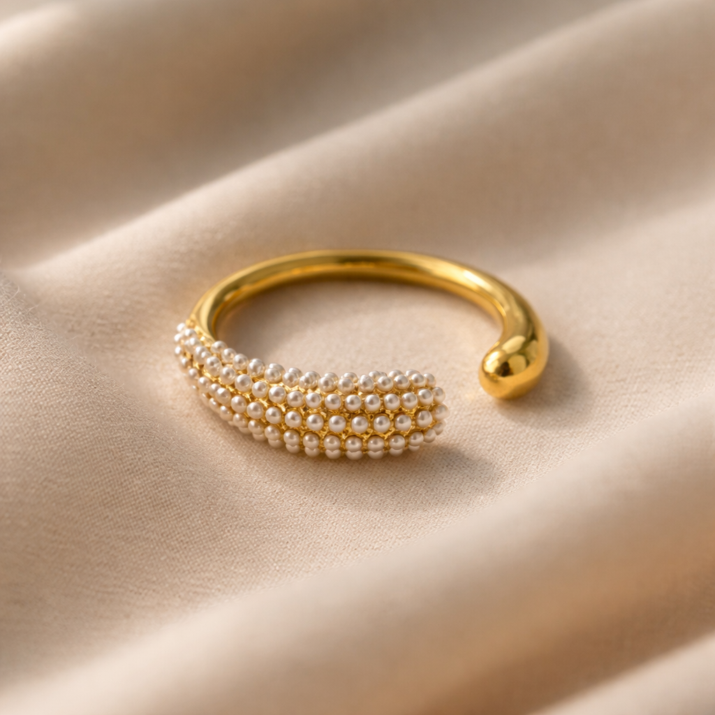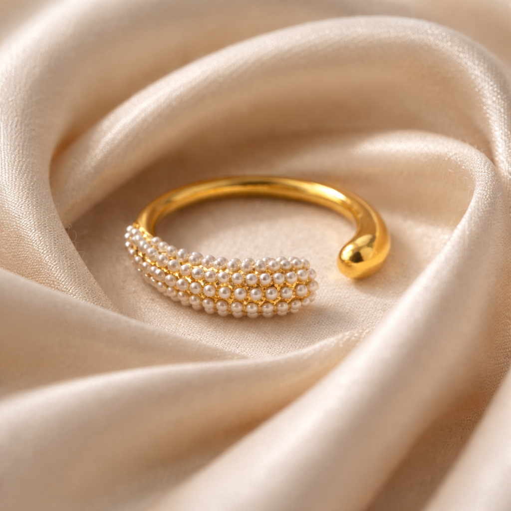The Lumina Pearl Open Ring is a graceful expression of softness and modern elegance. Crafted from premium 316L stainless steel with a radiant gold-tone finish, this sculptural open-band design features a curved panel adorned with delicate micro-pearl detailing, creating a luminous texture that feels both romantic and contemporary.
