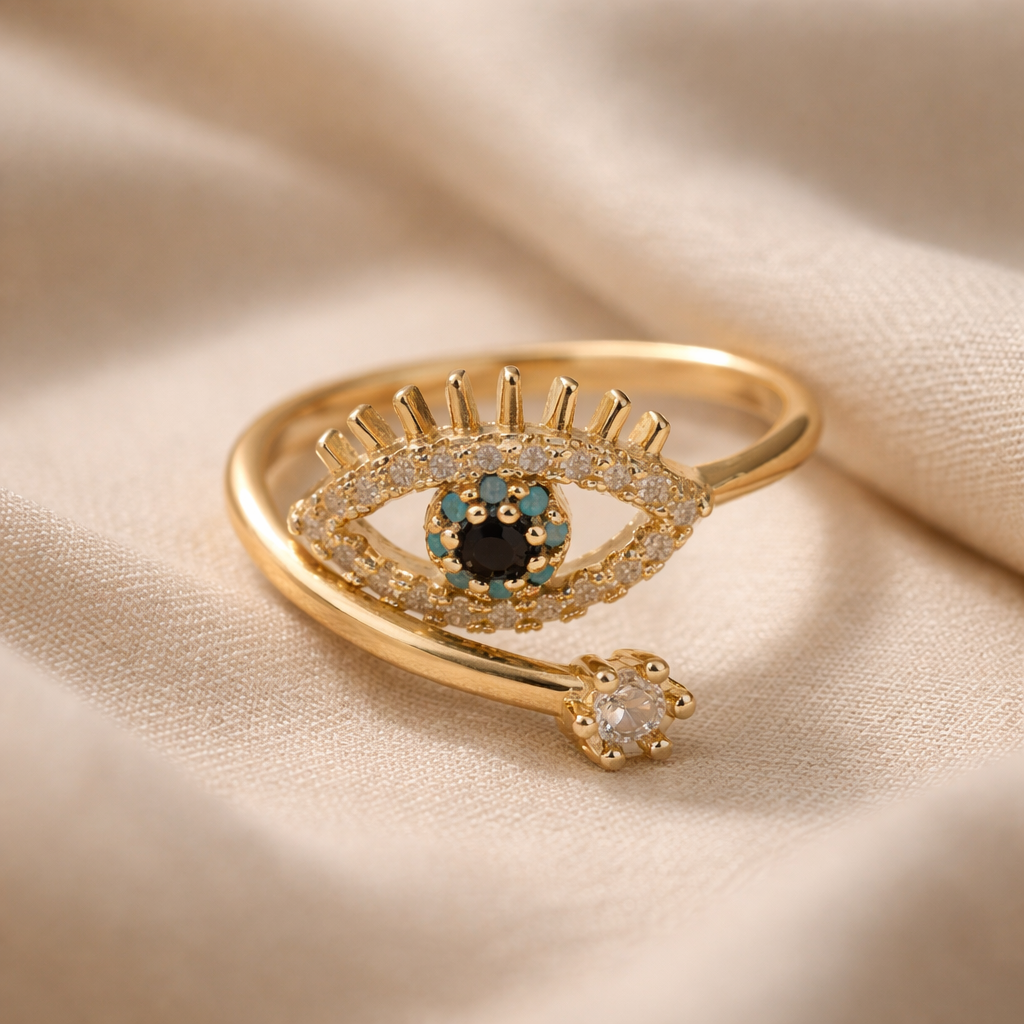 The Nazare Eye Open Ring is a striking symbol of protection, intuition, and refined elegance. Crafted from premium 316L stainless steel with a luminous gold-tone finish, this adjustable open-band ring features an intricate eye motif adorned with pavé crystal detailing, turquoise accents, and a deep central stone that creates a captivating focal point.