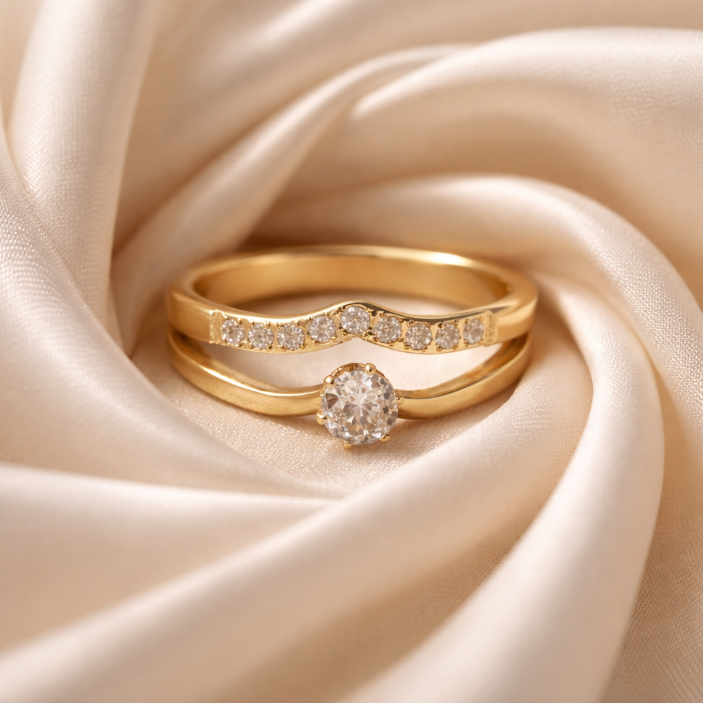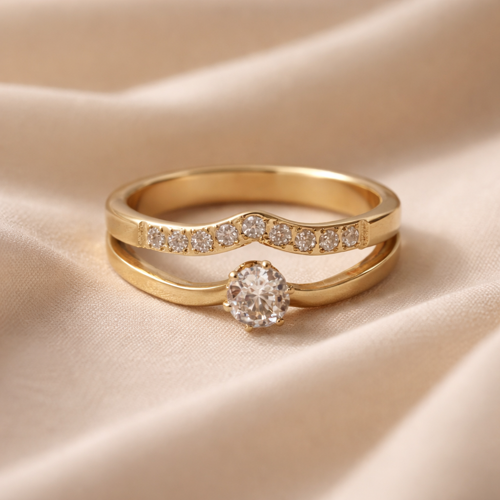 The Amara Duo Eternity Ring is a graceful union of classic sparkle and modern refinement. Crafted from premium 316L stainless steel with a radiant gold-tone finish, this elegant two-band design pairs a delicate pavé-set ring with a brilliant round solitaire, creating a beautifully layered silhouette that feels both timeless and contemporary.